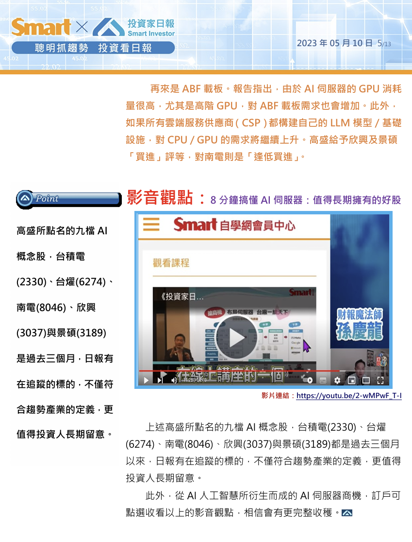 此外,從AI人工智慧所衍生而成的AI伺服器商機,訂戶可點選收看以上的影音觀點,相信會有更完整收穫。