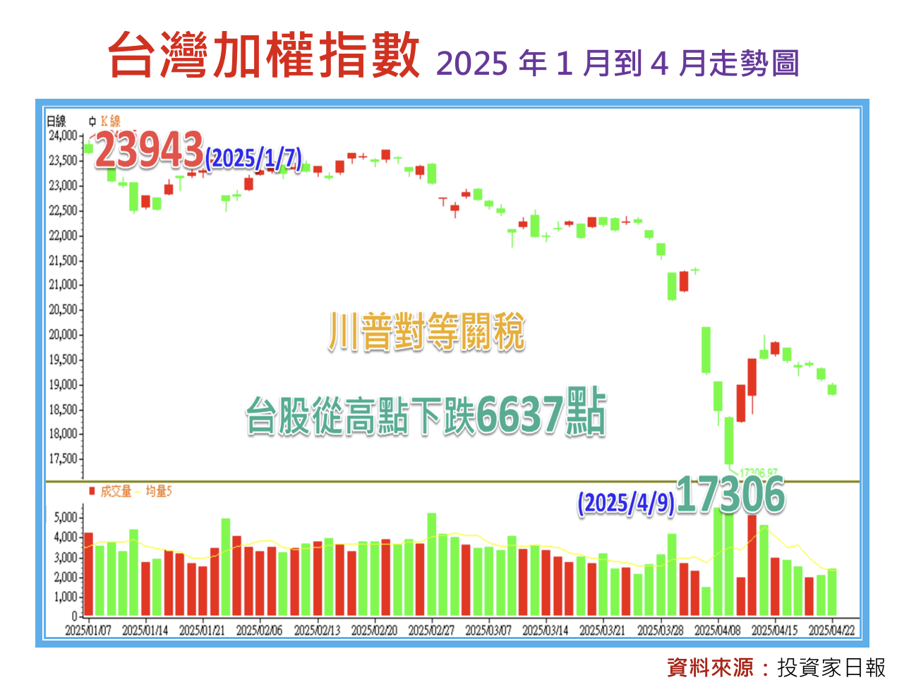 台股就在此一背景下,2025年4月出現明顯震盪,4/9一度跌到到波段的最低點17306,距離1/7的高點23943,整整下跌6637點,畢竟台灣作為美國主要貿易逆差國之一,若面臨如川普版上所揭示的32%超高關稅,這種「無差別攻擊」恐讓台廠陷入極大麻煩。