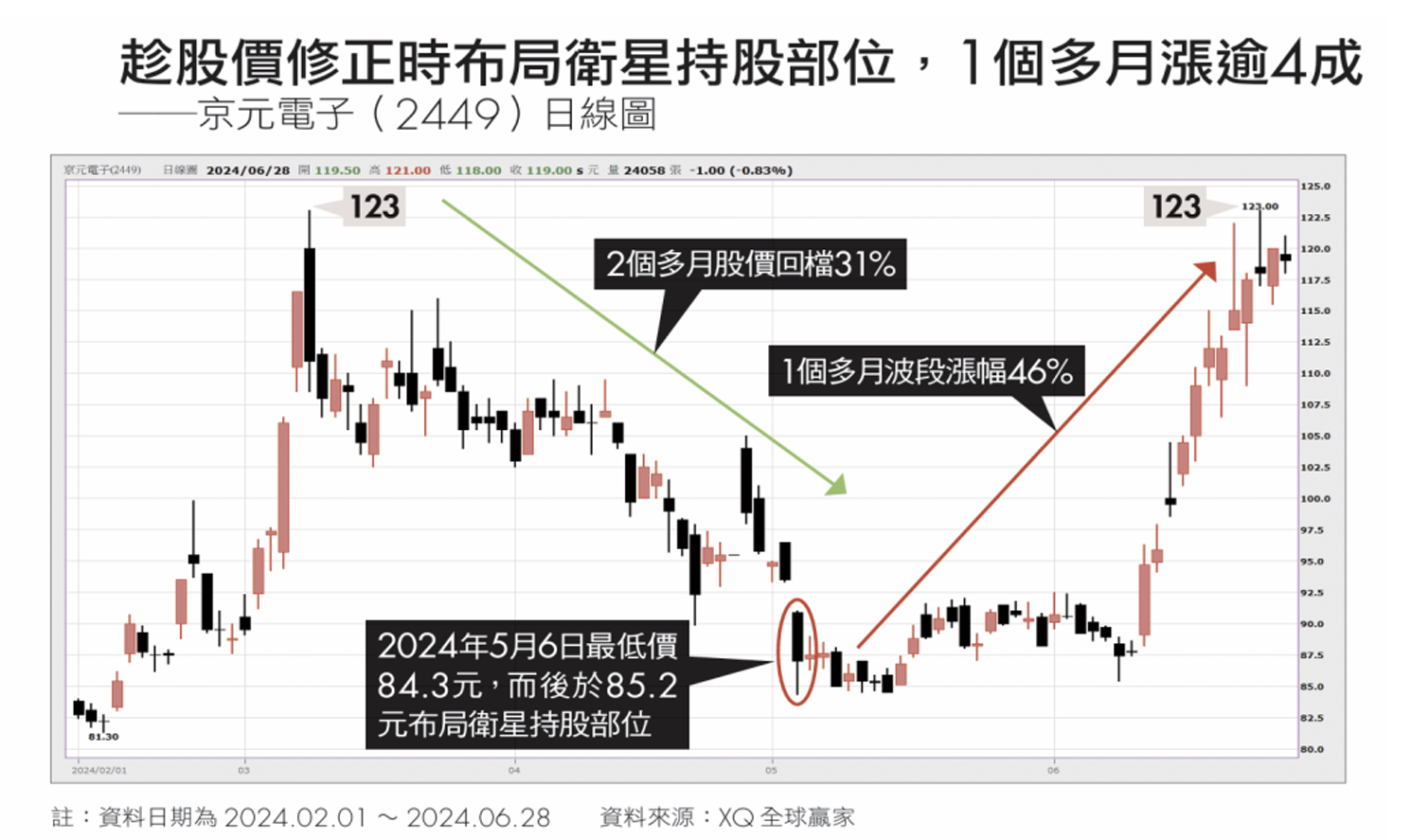 024年5月,隨著京元電子股價一路從同年3月8日最高點123元,跌到5月6日最低點84.3