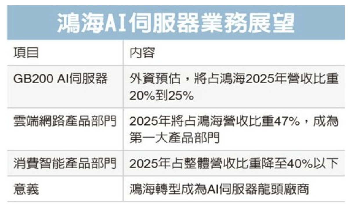 回顧2024年7/30的日報內容,當時分析指出:要評估台股第二大權值股鴻海(2317)投資價值,必須得先針對未來營運的結構,有一個基本的認識,其中一篇來自2024年7/17《經濟日報》標題為【鴻海雲端營收占比明年衝50% 躍AI 伺服器龍頭】的新聞,或許能提供一些思考的方向,其報導如下: 搭載輝達(NVIDIA)「地表最強AI晶片」GB200的AI伺服器量產倒數計時,相關產品單價是傳統伺服器十倍以上,成為推升鴻海2025年業績爆發的主力產品。業界估,明年鴻海(2317)雲端網路部門占整體營收比重將達45%到50%,創新高,取代以iPhone為主的消費智能產品部門,成為最大營收貢獻產品。 2007年以來,iPhone代工是鴻海集團業績增長主力產品,隨著明年相關業務被AI伺服器與網通產品取代,為18年來首見,意味鴻海轉型成為AI伺服器龍頭廠。倘若來自雲端產品占鴻海(2317)營收的比重,誠如上