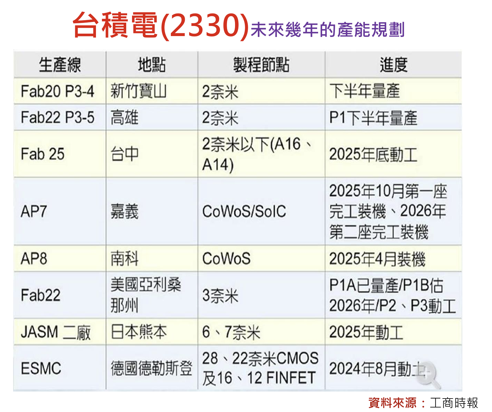 台積電(2330)持續擴建先進製程產能,包括新竹寶山、高雄、台中等地多座2奈米與2奈米以下的晶圓廠,也預計將在2025年到2027年陸續投產。值得一提的是,台積電的Fab25產線的台中晶圓廠,將於2025年底開始動工,目標是支援A16與A14晶片製程,期望能進一步鞏固台灣在先進製程的領導地位。【產業小百科】: 相較於N2P(2 奈米改良版),預計可帶來8–10%的速度提升、15–20%的功耗降低,並提升約1.10倍的晶片密度,預計在2026年下半年開始進入量產,其設計主要針對資料中心與AI運算晶片A16 相較於N2製程,可提升約15%的處理速度,或節省25–30%的功耗,並提升20–23%的晶體密度,預計在2028年進入量產,主要定位於客戶端裝置,例如手機、平板等應用市場。A14本文From《投資家日報》2025年9/5現在訂購,不但可加入日報專屬Line群更可免費回看五天日報【日報預覽
