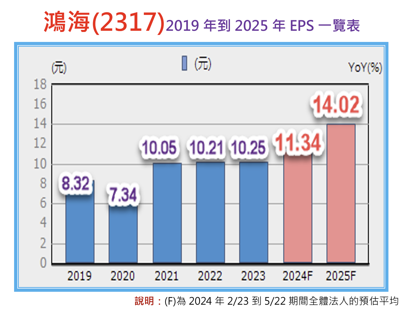 舉例來說,當鴻海的股價今年從98.5元,上漲到5/23的173元,5個月急漲75%之際,5/23的日報內容,便透過本益比的財報分析,合理推估以2025年鴻海的獲利預估,所得出的法人預估將落在236.8元,雖然至今還未達陣,但若以7/9鴻海的股價最高漲到234.5元,兩者僅差2.3元,確實也展現了高度的參考價值。瘋狂價 回顧2024年5/23日報內容,重點摘錄如下:截至目前為止,全體法人對於鴻海2024年EPS預估,平均值落在11.34元,較3/25日報中所顯示的11.31元,微幅上升0.03元,對於鴻海2025年EPS預估,平均值落在14.02元。值得一提的是,追蹤2018年以來鴻海的獲利表現,確實看到有逐步上升的趨勢,一路從2018年到2020年平均7.89元(編按:2018年為8.32元、2019年為8.03元、2020年為7.34元),成長到2021年到2023年平均10.17元(