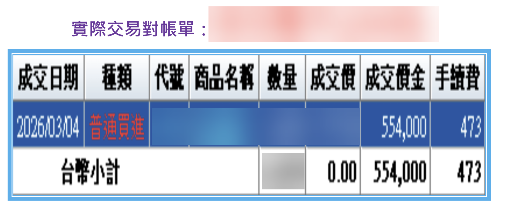 下圖表是實際股票的交易對帳單,其內容參考如下:(一)種類:普通買進(二)股票名稱:****(****)(三)買進日期:2026年3/4(四)買進價格:****元,跌到****年獲利預估的便宜價。(五)買進股數:****股(六)買進成本:554,000元。(全文、未完) 本文From《投資家日報》2026年3/4現在訂購,不但可加入日報專屬Line群更可免費回看五天日報 @我要【訂購】《投資家日報》或《Ai小琳》