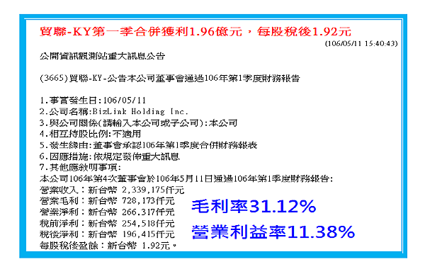 外,貿聯公布第季財報,在毛利率維持在、營業利益率達的獲利水準下,繳出元成績單,並創下公司上