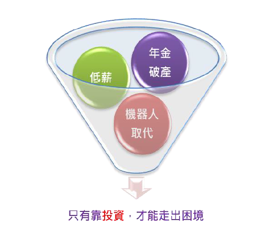 人不僅身陷在「什麼都漲,只有薪水不漲」的惡性循環裡,未來還要面對「退休年金不保」、「機器人