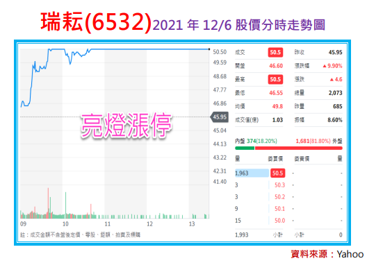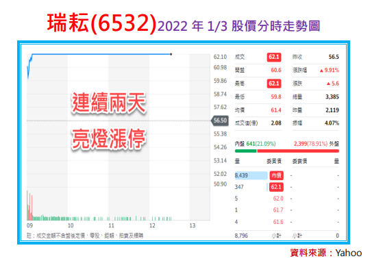 設備股瑞耘今天亮燈漲停,股價最高來到元,若以日報開始追蹤時的股價元計算,不僅個交易日股價漲