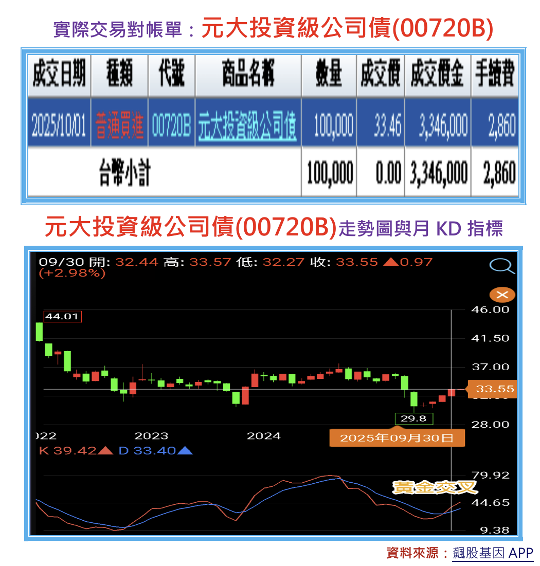 月KD指標出現低檔黃金交叉,以元大投資級公司債(00720B)為例,今年9月底的月K值為3
