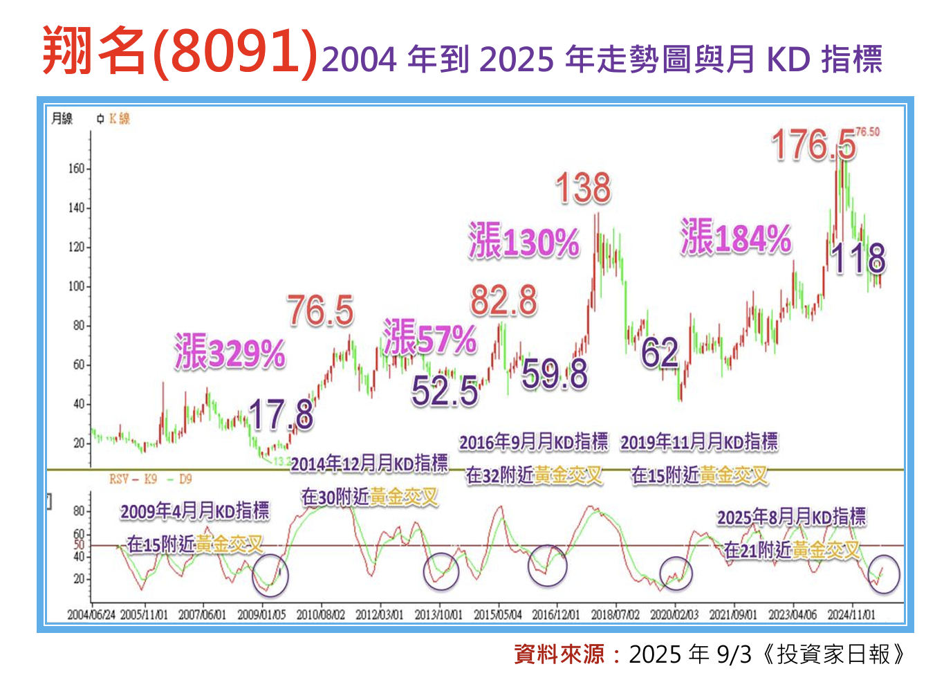 5年8月底出現月KD指標在25以下黃金交叉的口袋名單,核心業務在半導體設備的翔名(8091
