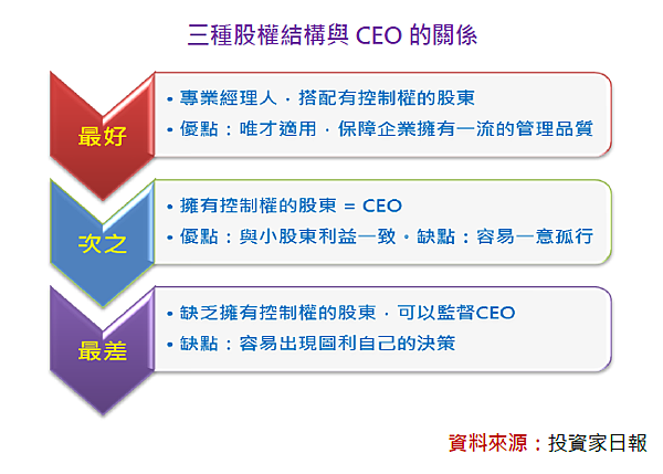 的分析師文章,一般而言,CEO與股權結構的關係,可分為三個等級,分別為:(一)CEO為專業