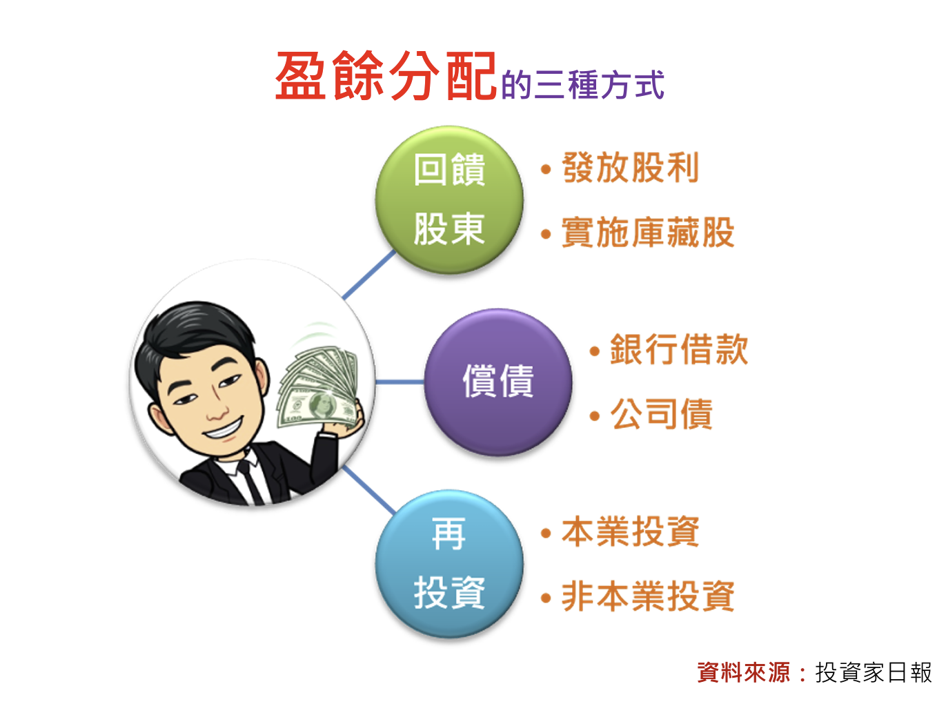 一家企業可以將年度的盈餘,或著是前幾年累積的盈餘,做以下三種分配:(一)回饋股東:包括發放