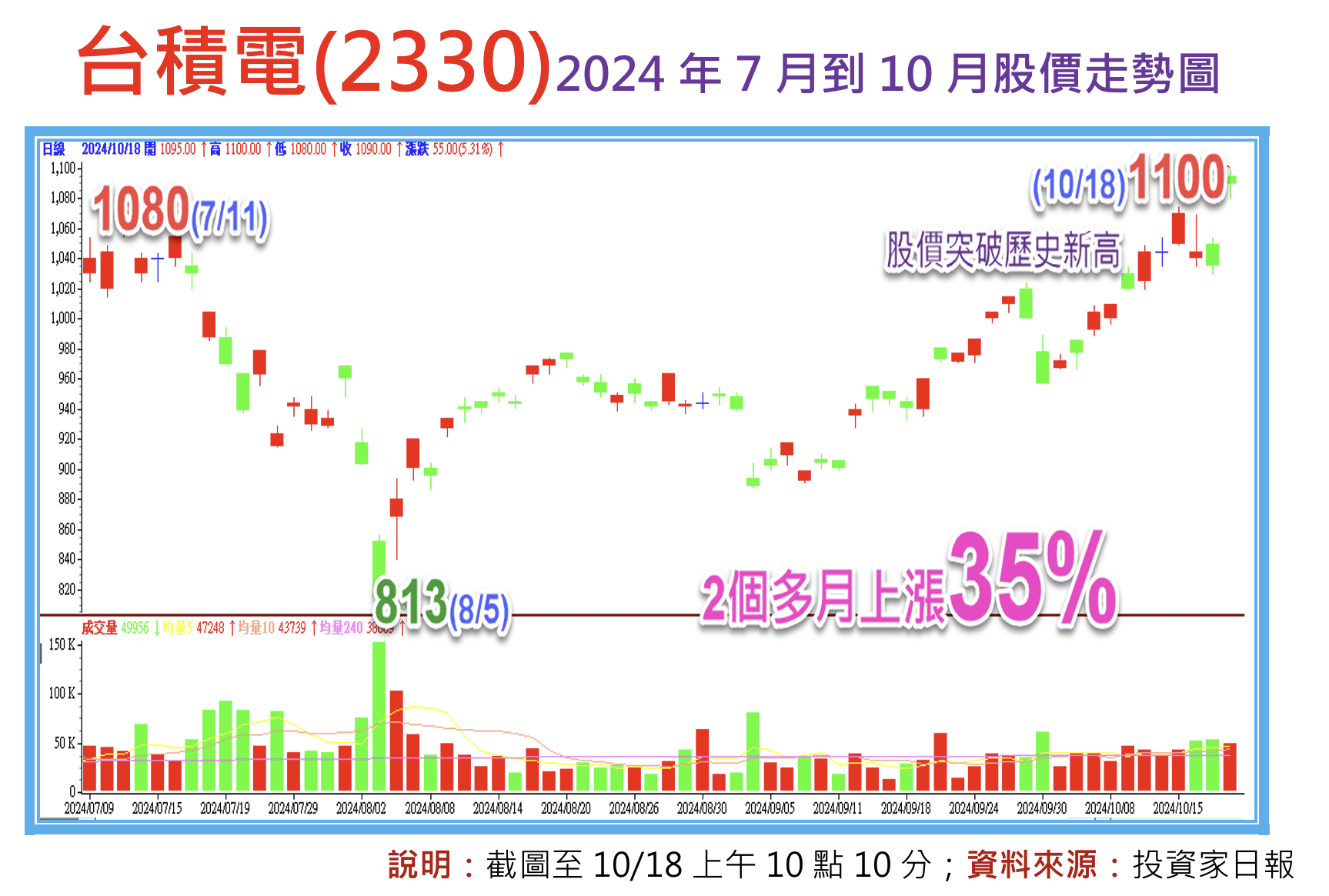 權值股台積電(2330),雖然近期的股價已經從8/5的最低點813元,上漲到10/18盤中